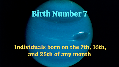 Those who has the birth date 7th, 16th, and 25th are considered as Birth Number 7. The date of birth 16th and 25th are converted into single digit by adding its double digit number from 16 = 1 + 6 = 7 and 25 = 2 + 5 = 7. And number 7 ruled by Ketu. Sometime, this number 7 is considered to be ruled by Neptune.